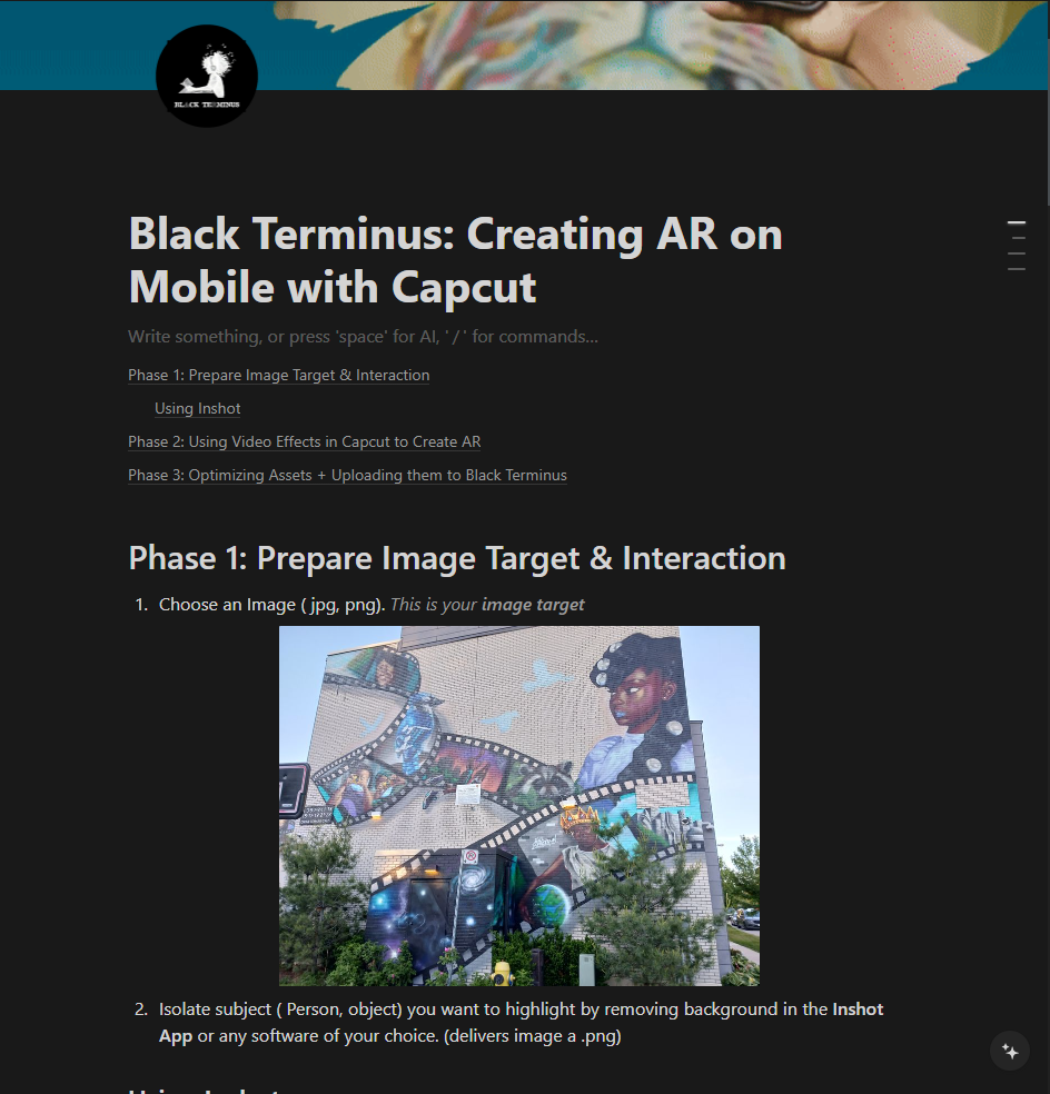 Education and Workshops at Black Terminus Skip to Videos All | Mobile AR Experiences | Mobile AR Experiences, • 6/13/23 Intro into Creating Augmented Reality Art You will learn to basics of using Black Terminus AR to create on the platform Want to go at your own pace? Written Notion Guides Mobile Guides AR on Mobile with Capcut Desktop Guides AR on Desktop with Capcut